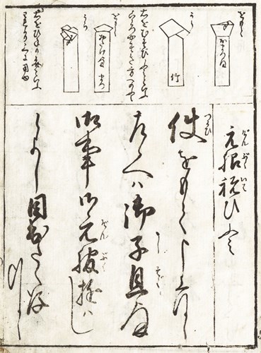 Onna-yō tenarai kagami (‘Spiegel van de schrijfkunst voor vrouwen’, herdruk uit 1842). De afbeelding boven de tekst geeft voorbeelden van hoe je een brief op kunt vouwen. Collectie Aafke van Ewijk.