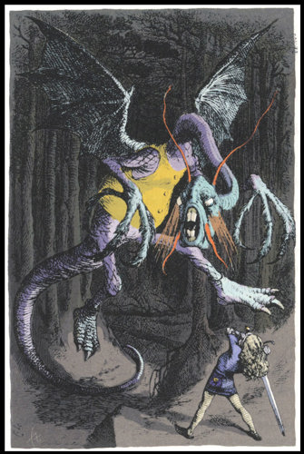 Het portret van de Jabberwrok is afkomstig uit Lewis Carrol, Alice in Wonderland & in Spiegelland, vertaald door Robbert-Jan Henkes, met de oorspronkelijke tekeningen van John Tenniel, ingekleurd door Floris Tilanus, Van Oorschot 2025 (2024)
