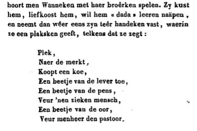 Eerst was er Jaek Vandevelde met zijn artikel “Kinderzeden” in het Nederduitsch letterkundig jaerboekje voor 1844, elfde jaargang, Gent, drukkerij der gebroeders Michiels, 66-76 (door de auteur geschreven te Dendermonde in 1843). In dat boekje vond ik op bladzijde 74 een attestatie van het lieddichtje "Plek"...