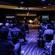 Die avond splitst de Chroniclesgroep zich na een haastig diner op om allerlei dingen te zien. Ik loop dan weer met die, dan weer met die een zaal in. Drankje halen, praatje maken, maar ik ben nergens langer dan zes minuten. Eigenlijk is dit mijn favoriete festivalervaring. Menig filmfestival heb ik in foyers en lobby’s doorgebracht, niet in de zaal waar je niks mag zeggen. Geen inhoud, wel de vorm. Ik ben een phony op Crossing Border en heb nog nooit een boek opengeslagen.