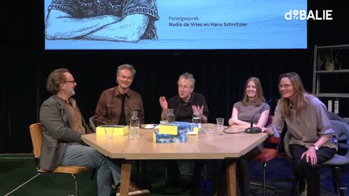 De toespraak is tevens terug te zien op het YouTube-kanaal van De Balie, en wel hier: https://www.youtube.com/live/A-lNI057AZ4?si=uJA9w52E8VbQAtGa, te beginnen op 1:02:44. Op het screenshot: moment uit de beantwoording van vragen uit het publiek na afloop, van tzum geplukt, hier: https://www.tzum.info/2026/03/filmpje-robbert-jan-henkes-maartje-wortel-en-nadia-de-vries-in-deel-1-van-drieluik-over-eindeloos-vertier/ met v.l.n.r. Hans Schnitzler, Allard den Dulk, Robbert-Jan Henkes, Nadia de Vries en Maartje Wortel.