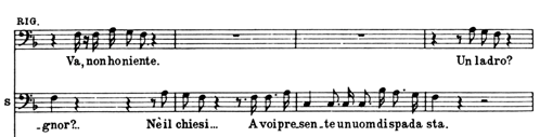 Als voorbeeld neem ik een fragment uit Rigoletto: het begin van het duet tussen Rigoletto en huurmoordenaar Sparafucile. De betekenis van de Italiaanse tekst is op te delen in vijf stukjes: Sparafucile stelt zich voor aan Rigoletto (1), die in sombere gedachten verzonken is. Rigoletto schrikt (2), en reageert afwerend (3). Sparafucile sust hem (4) en maakt in bedekte termen duidelijk welke dienst hij aanbiedt (5). Mijn vertaling bestaat eruit die betekenis met een Nederlandse tekst aan de bestaande partituur te koppelen. Voor de verantwoording van mijn keuzes verwijs ik af en toe naar onderstaande partituur; van het bewuste fragment ontbreekt alleen de c van de voorafgaande maat, waarop Si van Signor wordt gezongen – een kwart lager dan de f bij gnor. Onder dat fragment staat de tekst zonder muziek, met mijn eigen vertaling en de meeste recente DNO-vertaling, van de in 1997 overleden Jenny Tuin, eronder. Het Nederlands van de eerdergenoemde zangvertaling uit 1927 – die ritmisch overigens niet helemaal past – is ernstig verouderd en laat ik buiten beschouwing.